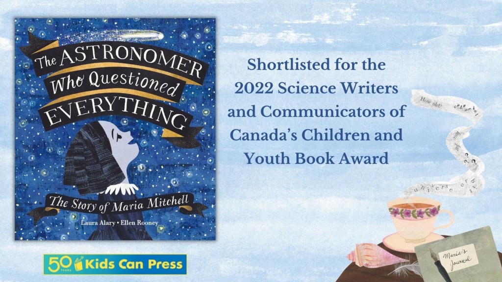 I am over the moon to share the news that The Astronomer Who Questioned Everything: The Story of Maria Mitchell (Kids Can Press) has been shortlisted for the 2022 Science Writers and Communicators of Canada Children and Youth Book Award.